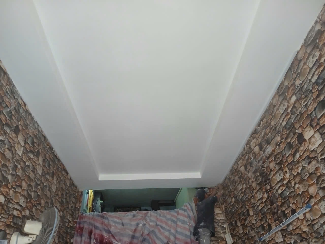Lớp sơn được lăn đều tay, không vệt, tạo cảm giác trần sáng, sạch và phản sáng nhẹ, giúp không gian rộng và thoáng hơn. - Bước 6 – Vệ sinh và nghiệm thu công trình:
